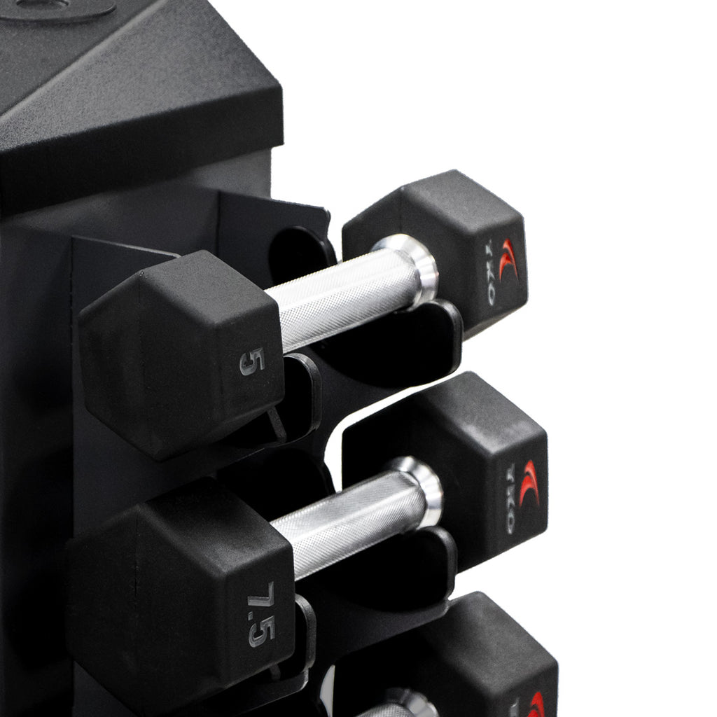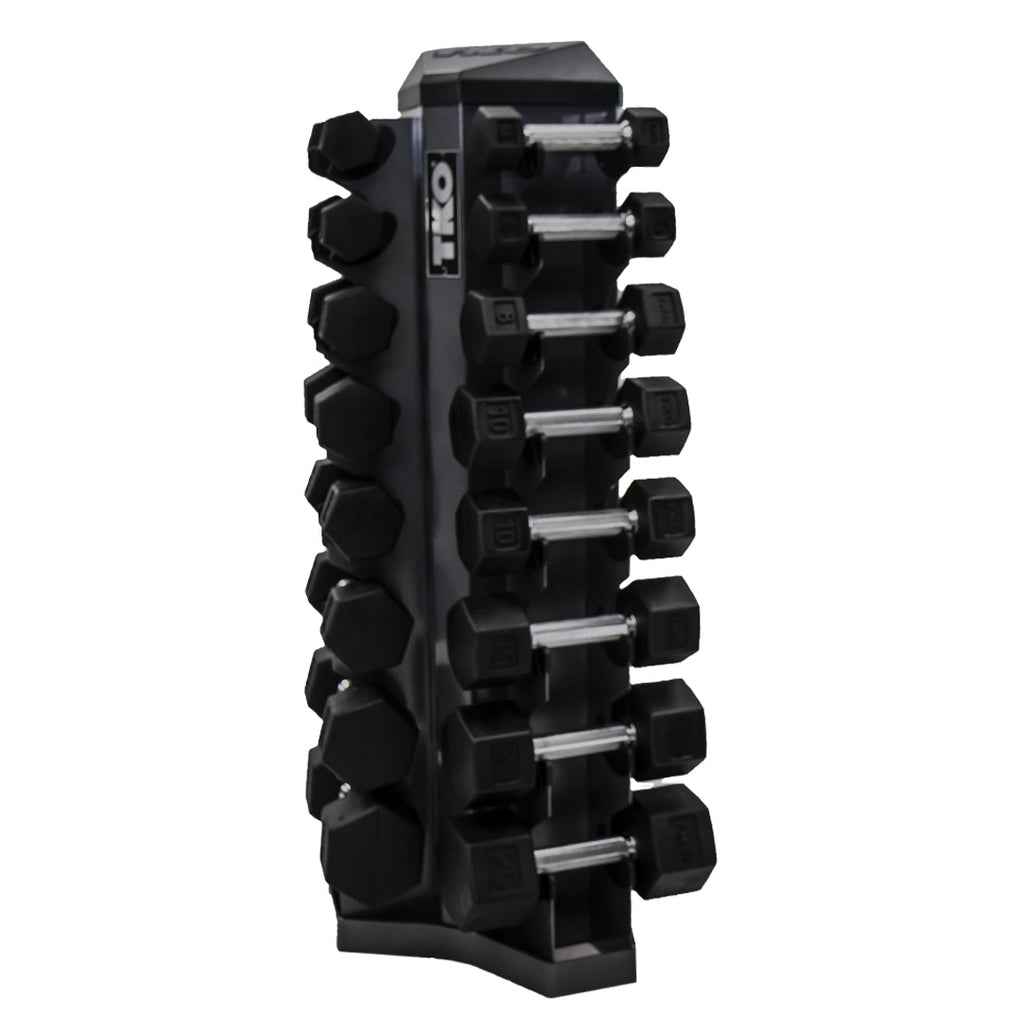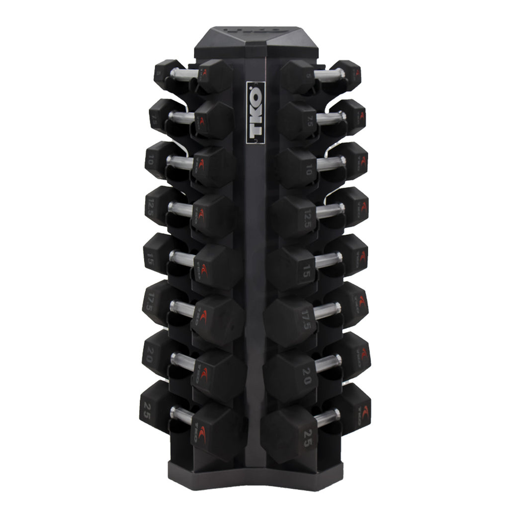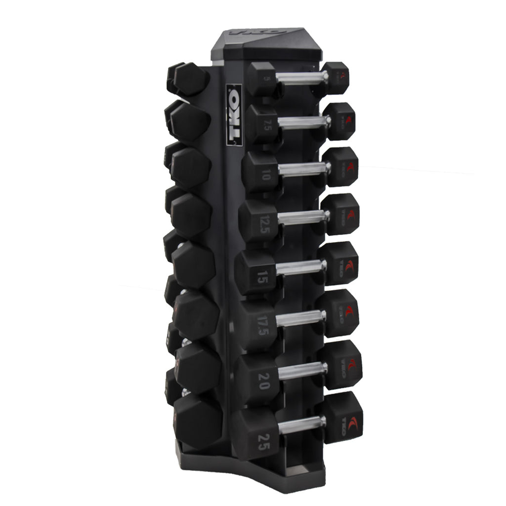 Holds 8 pairs of rubber or urethane hex dumbbells 3 to 25 lbs, Not designed for Gummi Bells.