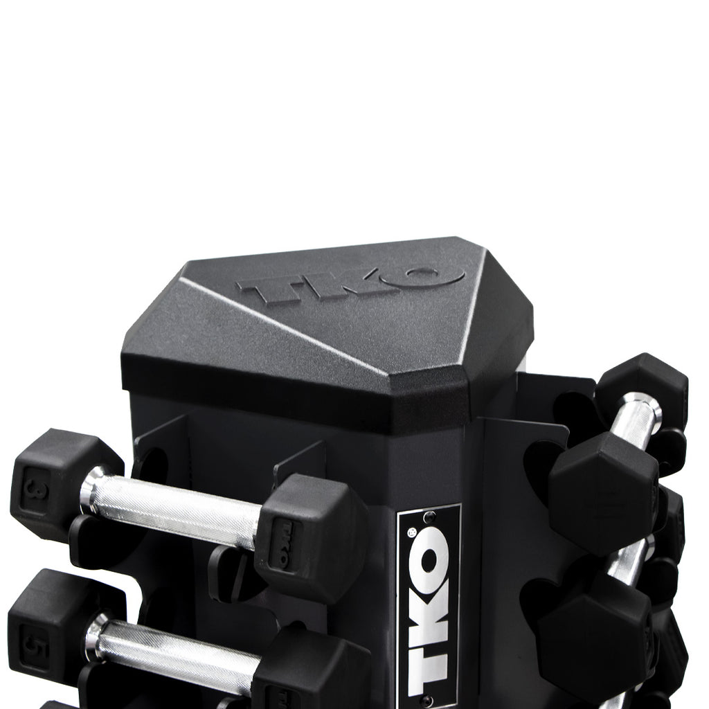 The TKO 8 Pair Vertical Dumbbell Rack is not only a space-saver, it is also long-lasting. The patented dumbbell rack features injection nylon covers on every cradle. This ensures your metal or vinyl covered dumbbells are not scratched or damaged while being stored. The cradle rows are also clearly labeled, so putting the dumbbells away is easy and organized.