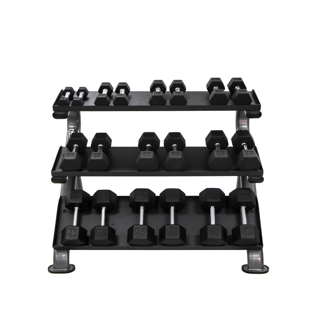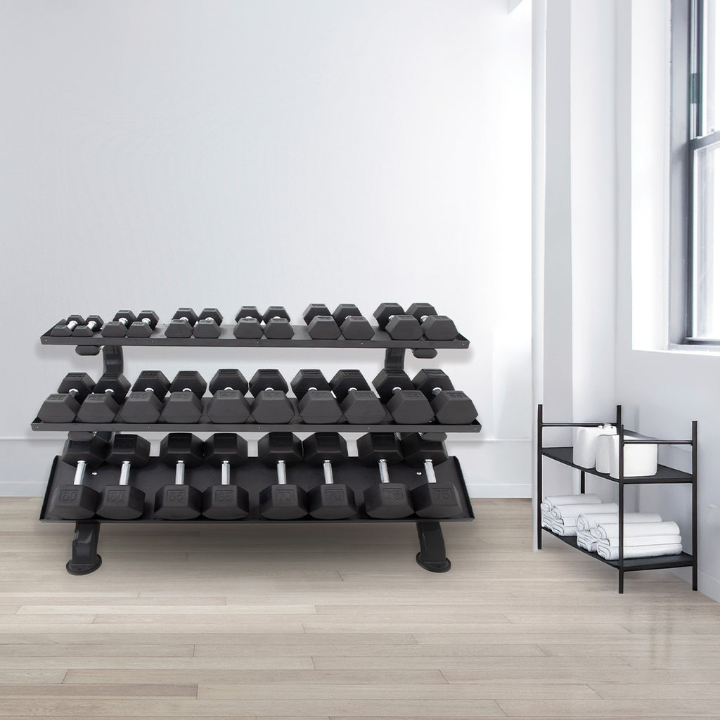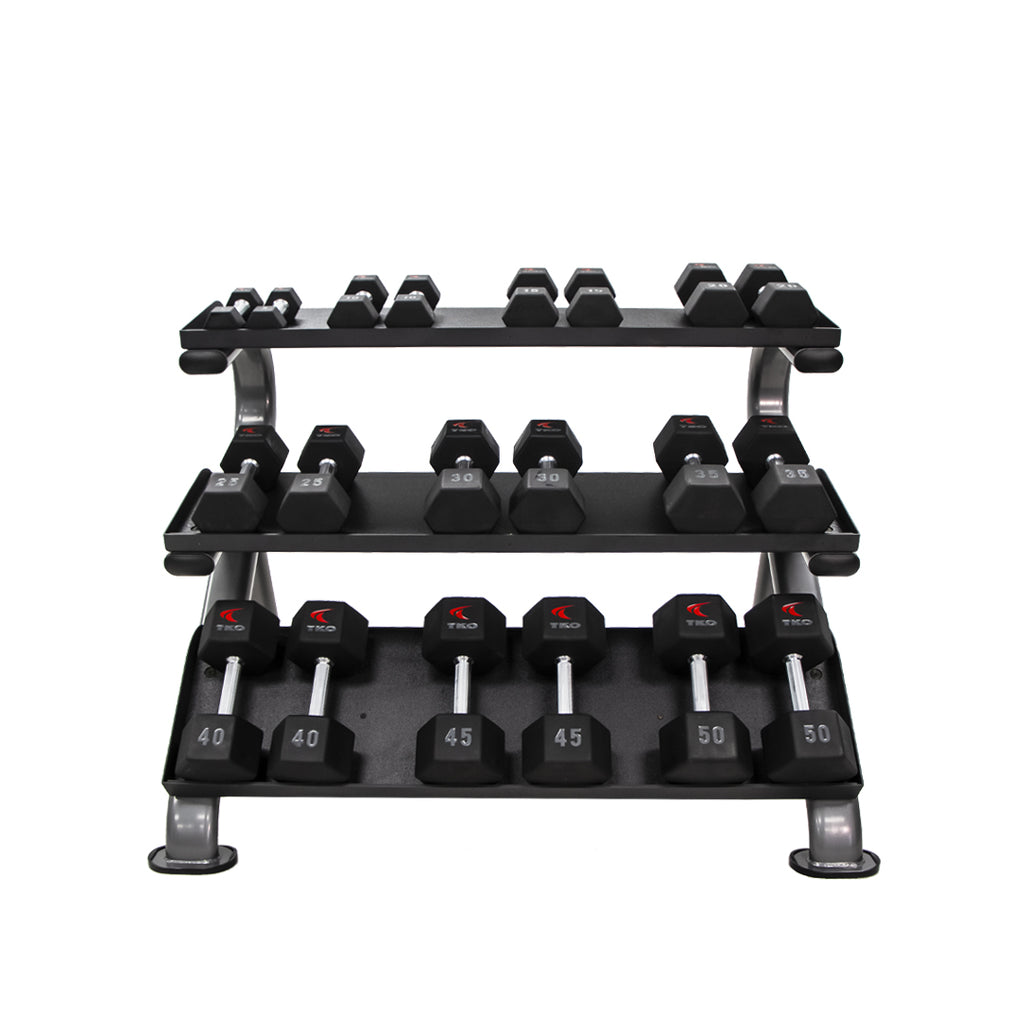 TKO 3-Tier full commercial rack allows for up to 12 pairs of dumbbells to be stored on a heavy gauge steel shelf, coated with a unique styrene liner to prevent damage to the shelf and the product, keeping the shelf looking new for years to come.